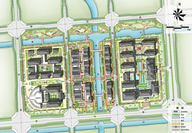 項(xiàng)目位于揚(yáng)州市樸席鎮(zhèn),樸席中部片區(qū)一期規(guī)劃范圍內(nèi),其四至范圍為∶東起興席路,南臨金山路,西至坤余路,北靠橫四路,總建筑面積12.79萬(wàn)平方米。以綠為基、以水為脈、以文為韻,并結(jié)合揚(yáng)州以及樸席地方建筑及文化特色,將公共建筑融入傳統(tǒng)元素,體現(xiàn)樸席禪宗文化、水鄉(xiāng)文化和席鄉(xiāng)小鎮(zhèn)特色,塑造現(xiàn)代文明與古代文化交相輝映的揚(yáng)派席風(fēng)建筑風(fēng)格。結(jié)合濱河步道、城市休閑綠道,串聯(lián)各城市生態(tài)休憩節(jié)點(diǎn),構(gòu)成完整的健康活力環(huán)。依托麻線河兩側(cè)濱水商業(yè)街,打造公共服務(wù)休閑軸;根據(jù)功能分區(qū)特征,依托橫向景觀聯(lián)系,打造各功能聯(lián)系發(fā)展軸。規(guī)劃依托北側(cè)愛香河及公共綠地打造富有地方特色的濱河景觀廊道;依托南側(cè)城市綠帶,打造富有生機(jī)活力的城市休閑廊。形成康養(yǎng)服務(wù)片區(qū)、商業(yè)服務(wù)片區(qū)和醫(yī)療服務(wù)片區(qū)。